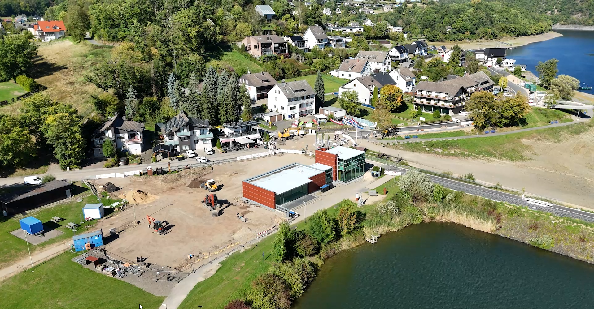 Auf der Baustelle in Rurberg geht es Schritt für Schritt weiter: Am Bauabschnitt 04 haben die Aufbrucharbeiten begonnen, und die erste Lage des ungebundenen Straßenoberbaus ist bereits eingebaut. Auch am Bauabschnitt 03 ist der Fortschritt deutlich sichtbar – die letzten Segmente des Edelstahlgeländers werden montiert. Anschließend folgt der Einbau des gefärbten Gussasphalts. Damit nimmt das Gesamtbild immer mehr Gestalt an.